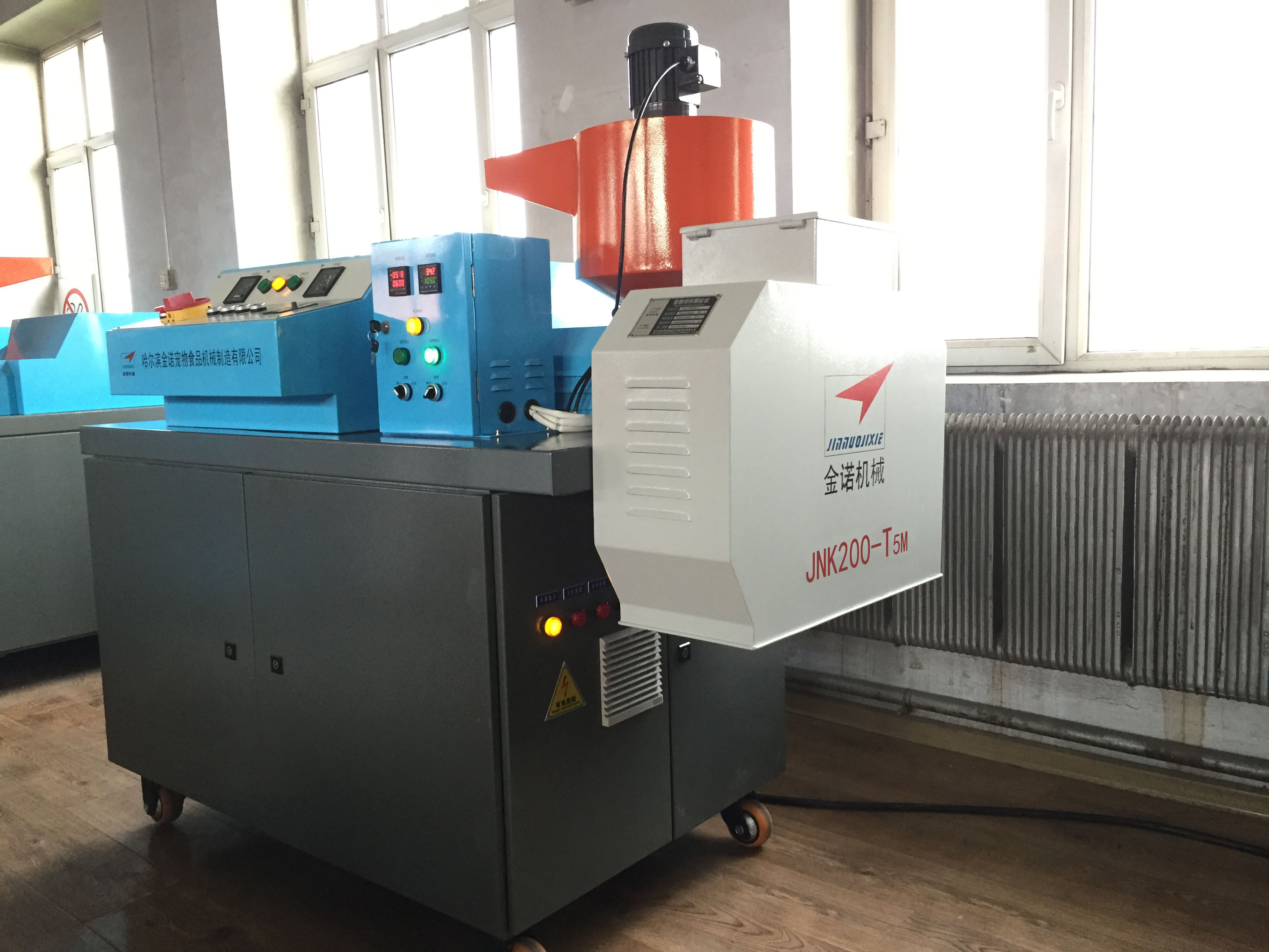 狗糧加工設備JNK200-T5M:1。JNK200-T5M型狗糧加工設備安裝方便、出廠已經(jīng)試機,狗糧機切刀采用直角切刀技術(shù),調(diào)試簡單;2。狗糧設備的主軸和切刀小軸均可隨時注入耐高溫潤滑脂,延長狗糧機的軸承使用壽命;3。JNK200-T5M狗糧設備每小時生產(chǎn)狗糧顆粒200公斤。